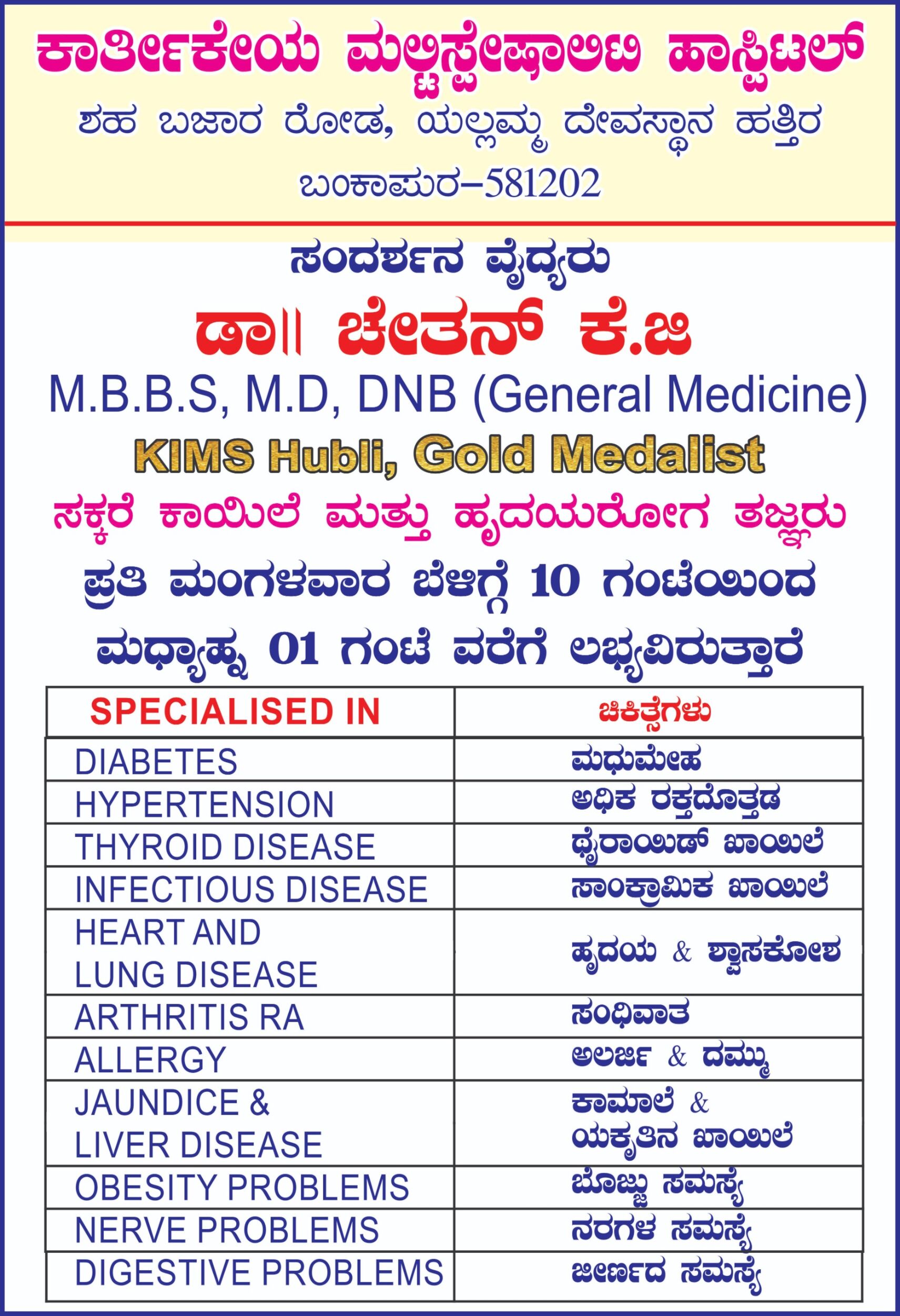 Every Tuesday Dr. Chetan will be visiting Karthikeya Multispeciality Hospital at Bankapura from 10am - 1pm